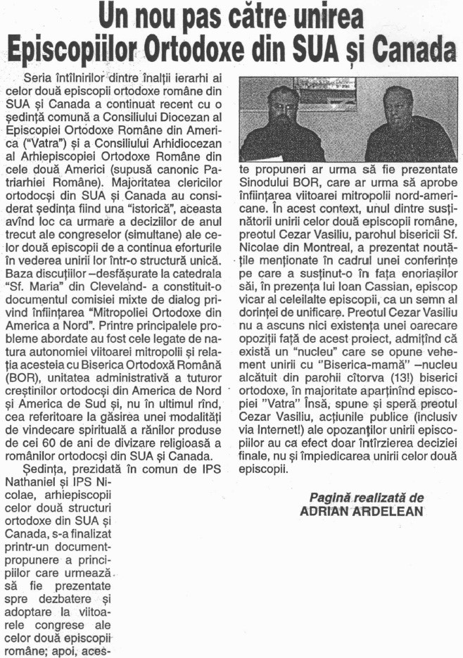 “UN NOU PAS CATRE UNIREA EPISCOPIILOR ORTODOXE DIN SUA SI CANADA”; un articol aparut in ziarul Roman- Canadian, ZIG- ZAG, editia Aprilie 2009.